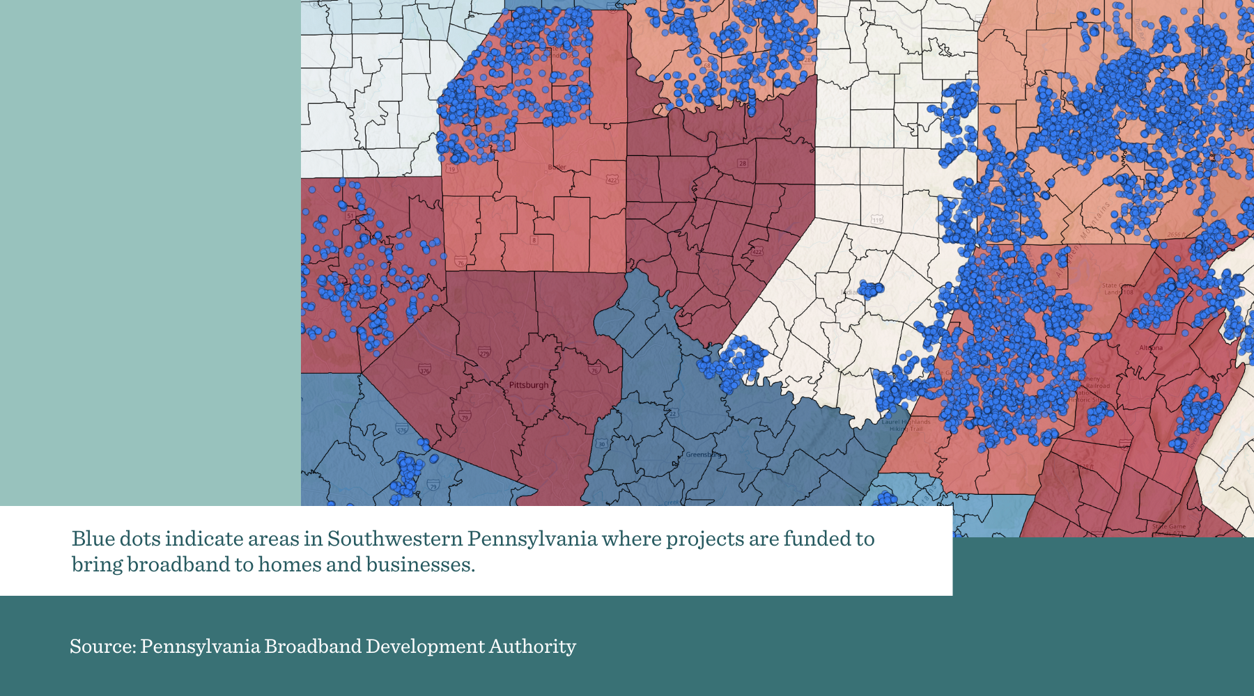 In Southwestern Pennsylvania there are projects in Butler, Indiana, Washington, Westmoreland, and Beaver counties. A map of areas awarded funding is available on the Broadband Authority website. The Authority has approved 53 infrastructure projects so far.